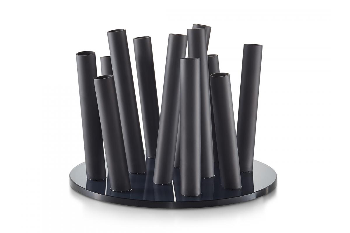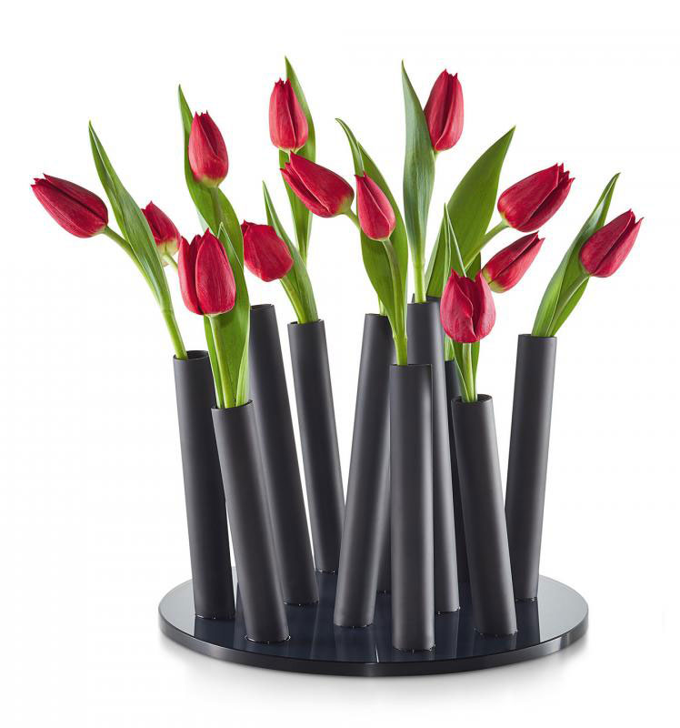 Matný černý odstín designové vázy Bouquet si přímo říká o aranžování rudých nebo bílých tulipánů, které svou barvou výstižně podtrhnou unikátní tvar vázy. Ocelové "stonky" jsou velmi precizně lepené ke skleněné základně se stříbrným logem Philippi. Váza se nejlépe vyjímá v moderních interiérech, kde s naprostou jistotou dominuje okolnímu prostoru.