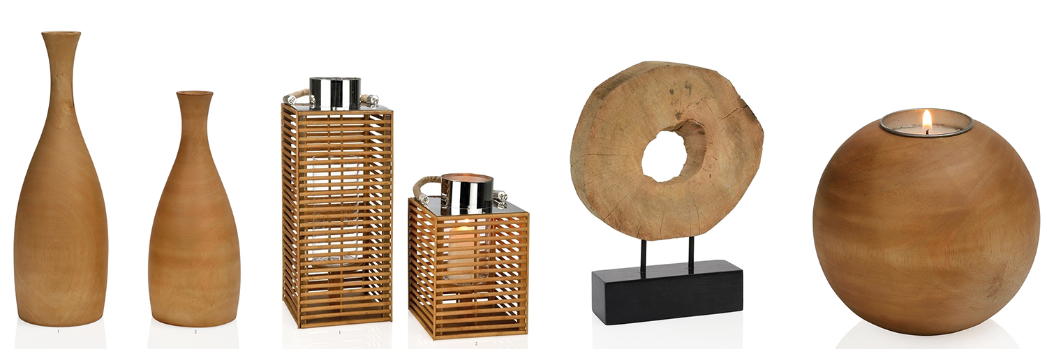 V případě dekorací ze dřeva bylo vybrané bambusové a mangové dřevo. Tyto dva druhy materiálů jsou jedny z nejoblíbenějších vůbec. Přírodní provedení v sobě nese kus poctivé práce zručných řemeslníků ze Španělska. Vázy, svícny, mísy na ovoce nebo sošky jsou zcela ručně vyřezávané do moderních tvarů zvelebujících váš domov.