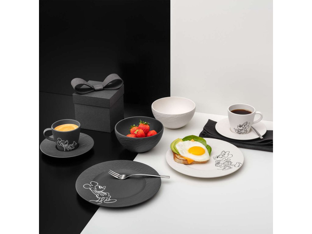 Matný porcelán s charakteristickou strukturou inspirovanou přírodní břidlicí vytváří výrazný kontrast k jemnému, minimalistickému motivu Mickeyho. Černá nebo bílá varianta podtrhuje grafickou čistotu celé kolekce a dodává jí současný, lehce urban nádech.