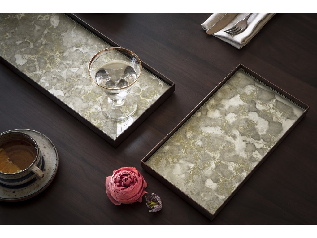 Kolekce podnosů patří do tvorby designérky Dawn Sweitzer. Hlavním prvkem jsou originální kresby tuší. Barva se na sklo nanáší ručně, takže design každého podnosu je jedinečný sám o sobě! Tvoří ho kovový rám a skleněná deska. Výrazná a luxusní kolekce podnosů rozzáří prostor nadčasovým designem a oslňujícími odlesky. Podnosy různých designů mezi sebou můžete kombinovat a vytvořit si skutečně originální styl! Vybírat můžete z široké škály barev, tvarů a velikostí. Stanou se perfektním doplňkem vašeho interiéru. Buďte odvážní, kombinujte!