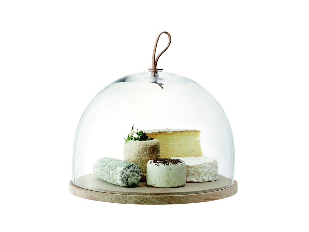 Působivý, stylový doplněk stolování – ručně foukaný skleněný poklop na stojanu z přírodního, povrchově neupraveného jasanu a s ouškem z ručně spletených kožených proužků. Schůdek na dřevěném podstavci zajišťuje poklop před sesmeknutím. Rozměr: průměr 30 cm, výška 22,5 cm. Materiál: masivní dřevo, sklo, kůže. Dárkové balení