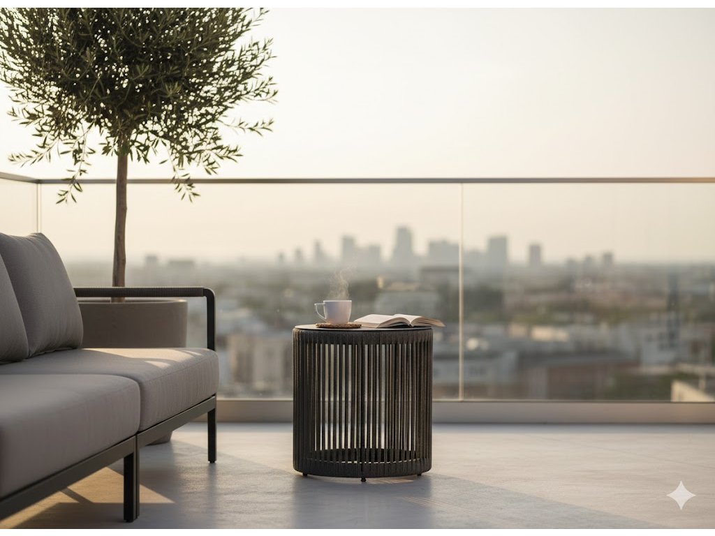 Konstrukce z práškově lakované oceli a pevné olefinové tkaniny odolá slunci, větru i dešti, je snadno omyvatelná a plně recyklovatelná. Ideální na terasy, zahrady a balkóny.