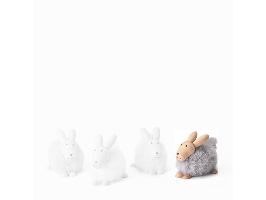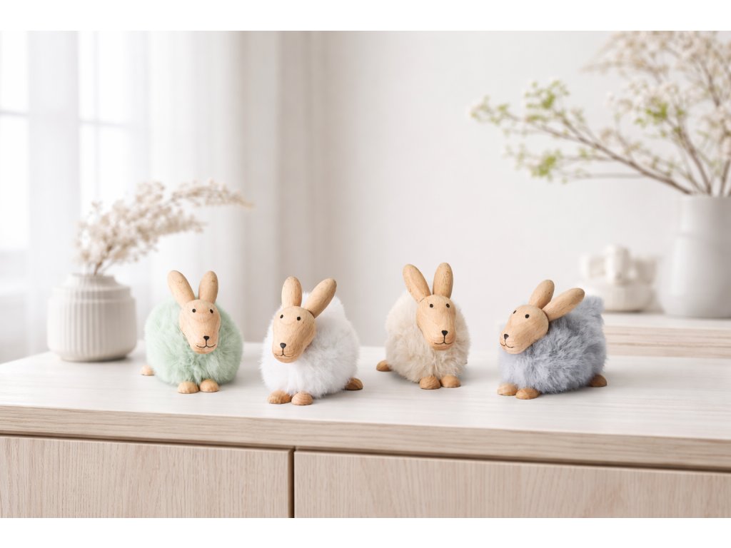 Roztomilý králíček Emily od Philippi v bílé, zelené, šedé a béžové barvě je vyroben z kvalitního bukového dřeva a hebké umělé kožešiny – stylová jarní dekorace, která potěší na pohled i na dotek.