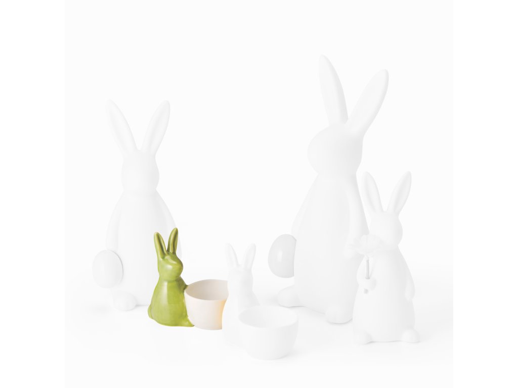 Ve stejném stylu můžete pořídit dva menší zajíčky o velikosti 8 cm s ošatkami na vajíčka a také větší dekorativní zajíce ve třech velikostech – držící vajíčko nebo jarní květinu. Všechny figurky jsou vyrobeny z kvalitního bílého porcelánu a zdobí je elegantně hladký povrch - na zajíčcích není vzor.