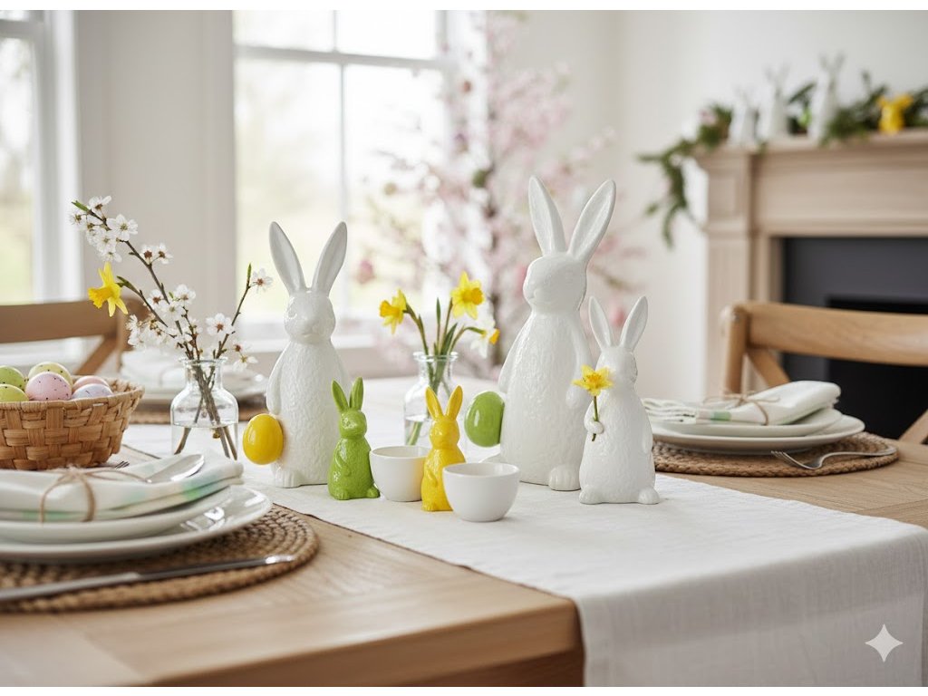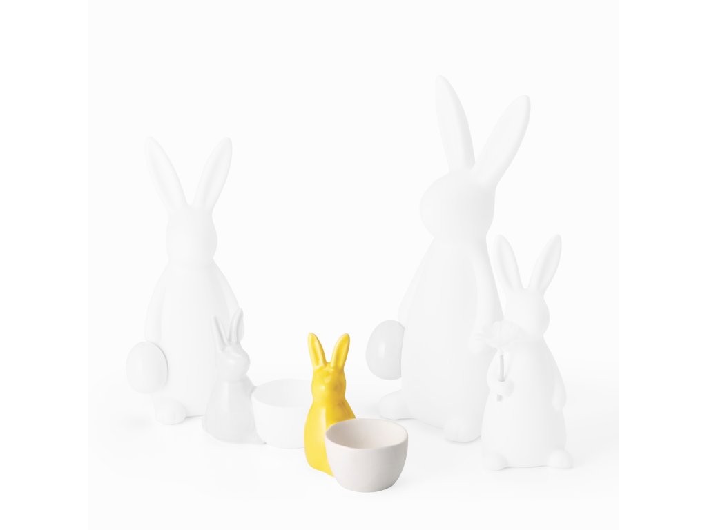 Ve stejném stylu můžete pořídit dva menší zajíčky o velikosti 8 cm s ošatkami na vajíčka a také větší dekorativní zajíce ve třech velikostech – držící vajíčko nebo jarní květinu. Všechny figurky jsou vyrobeny z kvalitního bílého porcelánu a zdobí je elegantně hladký povrch - na zajíčcích není vzor.