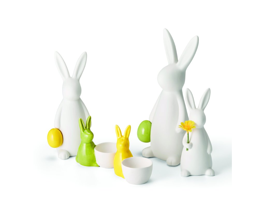 Ve stejném stylu můžete pořídit dva menší zajíčky o velikosti 8 cm s ošatkami na vajíčka a také větší dekorativní zajíce ve třech velikostech – držící vajíčko nebo jarní květinu. Všechny figurky jsou vyrobeny z kvalitního bílého porcelánu a zdobí je elegantně hladký povrch - na zajíčcích není vzor.